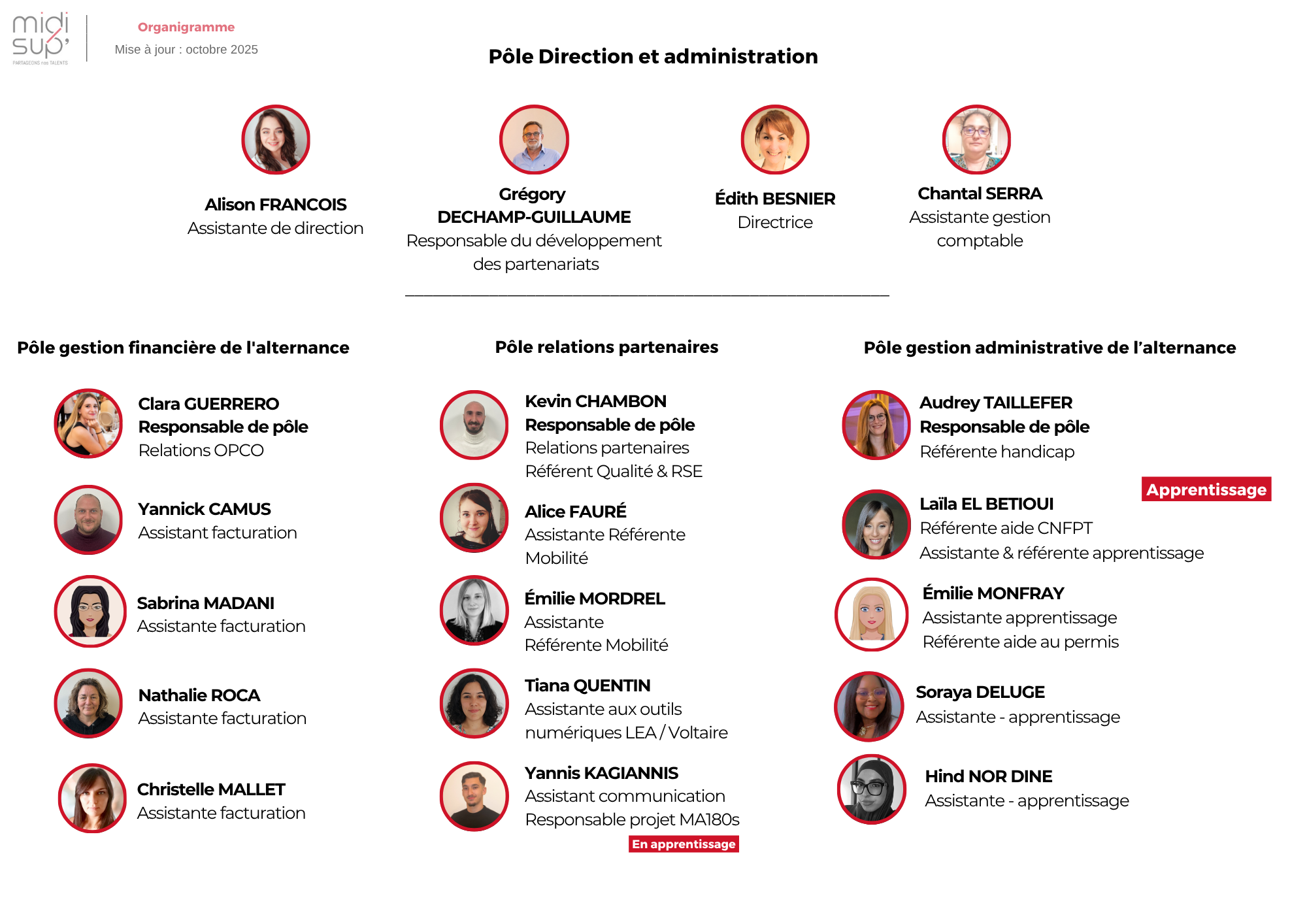 - Le Conseil d'Administration : vote les décisions stratégiques du fonctionnement de MidiSup, notamment les ouvertures/fermetures de formation. Il est composé paritairement d'entreprises et d'établissements de l'enseignement supérieur. La Région Occitanie y occupe également un siège.